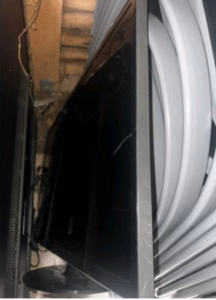 - Und der 55-Zoll-Smart-TV – mein teuer angeschafftes Gerät – hat auf der rechten Seite einen tiefen Riss oder Kratzer, der nicht zu übersehen ist.