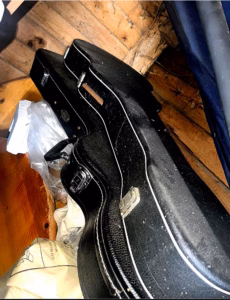 Der Koffer meiner Westerngitarre – das Herzstück meines Musikerlebens – offen, staubig, entwürdigt
