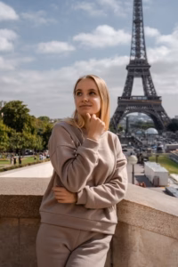 • Sie ist derzeit in Paris im Urlaub und hat sich extra von einem Touristen fotografieren lassen.