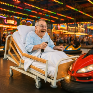 Ich habe ein lustiges Foto erstellt, auf dem ich als alter Mensch mit Pflegebett auf dem Autoscooter fahre.