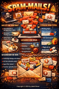 - Spam-Mails sind unerwünschte, massenhaft versandte elektronische Nachrichten, die meist zu Werbezwecken, Betrug, Phishing-Angriffen oder der Verbreitung von Malware dienen und ohne Einwilligung des Empfängers verschickt werden.